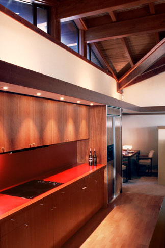 The warmth and friendliness of wood permeate the entire scheme. Ceilings are made of grooved cedar plywood, rafters and beams of structural douglas fir, with redwood trim inside and out.